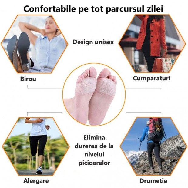 Designul tip fagure al pernitei metatarsiene face ca produsul sa aiba o buna capacitate de respiratie, iar cele 3 gauri separate permit acestui suport pentru picioare sa va infasoare mai bine avand un design anti-alunecare.