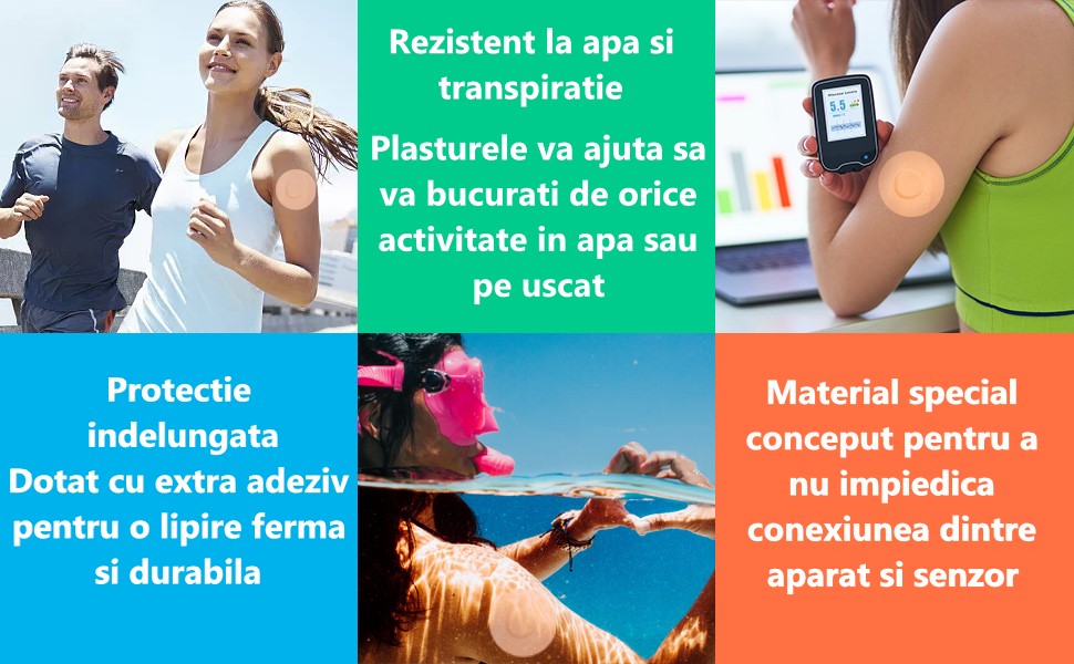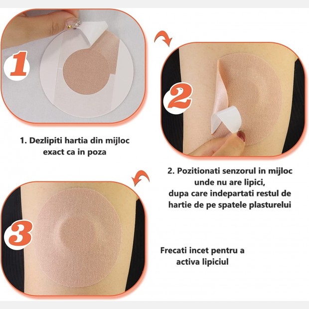 Plasturele are o zona in centru fara lipici aceasta fiind proiectata pentru sezorul de glicemie, dar se va lipi pe langa acesta potejandu-l si tinandu-l bine fixat pe piele.